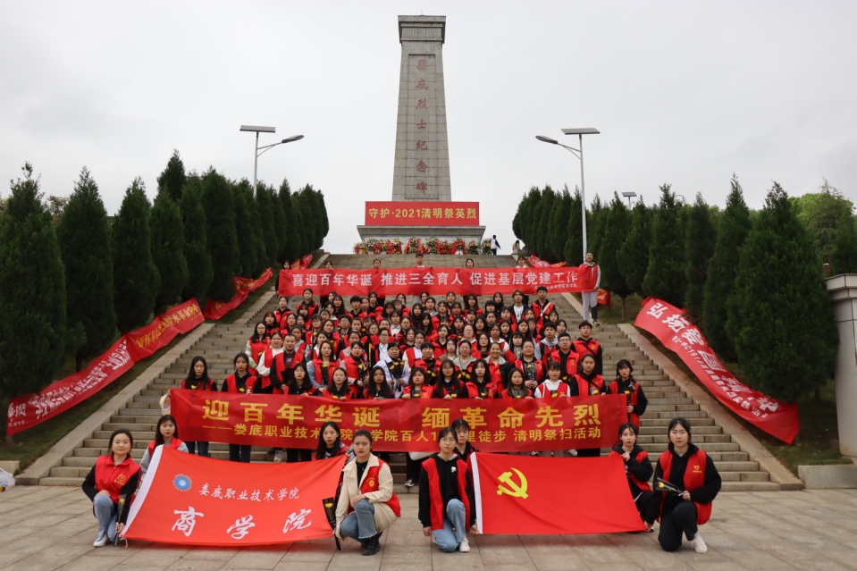 为进一步实行三全育人,坚持把立德树人作为中心环节,把思想政治工作贯穿教育教学全过程,引导学生在慎终追远、缅怀先辈的情怀中认知传统、尊重传统、继承传统、弘扬传统、增进爱党、爱国、爱社会主义情感。商学院团总支举办了 “迎百年华诞,缅革命先烈”为主题的百人十公里徒步活动,活动面向娄底职院全体在校学生。4月2日,商学院党总支书记禹云、教学院长郭赞伟带领胡婷、李祖湘、陈云梅、谭雪睛、刘双平、梁超东等老师、党员、入党积极分子、干部一起前往娄底烈士纪念园开展活动。