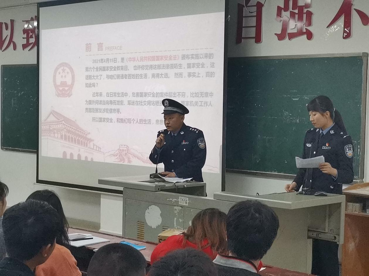 在讲座中,两位警官讲述了2021年4月15日是我国的第6个全民国家安全教育日。国家安全包括政治安全、军事安全、核安全、网络安全、文化安全、太空安全、科技安全、社会安全、国土安全、资源安全、经济安全、海外利益安全。两位警官用切实案例着重讲解了政治安全、生态安全、网络安全和社会安全的相关知识,以及和大学生之间的关系,他们用多年的工作经验告诉参与讲座的同学,作为大学生要多学党史知识、关注时事政治、多学法、用法律知识武装头脑,成长为对国家、对社会有用的人才。