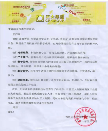 近日,农林工程学院收到了一封来自郴州正大农牧食品有限公司的表扬信,在这份表扬信中,该公司对我院畜牧兽医专业现代学徒制人才培养给予了高度评价。