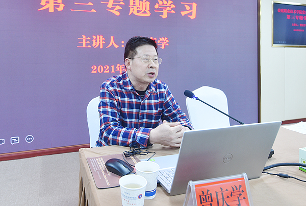 曾庆学的辅导报告题为《在学史崇德中纯洁党性永葆本色》。他指出,学史崇德就是要崇尚对党忠诚的大德、为民造福的公德、严于律己的私德,并结合丰富的历史事例详细阐述了学史崇德的重要意义、主要内容、基本要求。