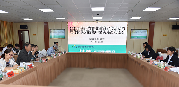 5月25日下午,湖南省教育厅职成处干部谢银满带队,湖南日报、华声在线、潇湘晨报、湖南教育电视台、长沙晚报、《湖南教育(职教)》 等媒体记者组成的2021年湖南省职业教育宣传活动周媒体团队来到我校,对我校进行集中采访。