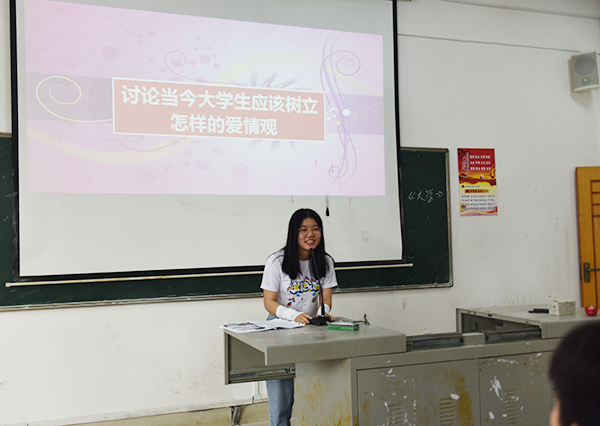 课程正式开始后,邓梦兰老师以悠扬的《梁祝》配乐导入新课,从《礼记·大学》“古之欲明明德于天下者,先治其国;欲治其国者,先齐其家;欲齐其家者,先修其身。”阐述了树立正确的爱情观对一个人修身、立业的重要性。在简单复习此专题前几次课内容框架后,引出本堂课要完成的主要任务。同学们积极热情,主动回答问题。随后,邓老师要求同学们分组讨论“当今大学生应该树立怎样的爱情观?”每组代表上台发言,陈述了各自的观点。