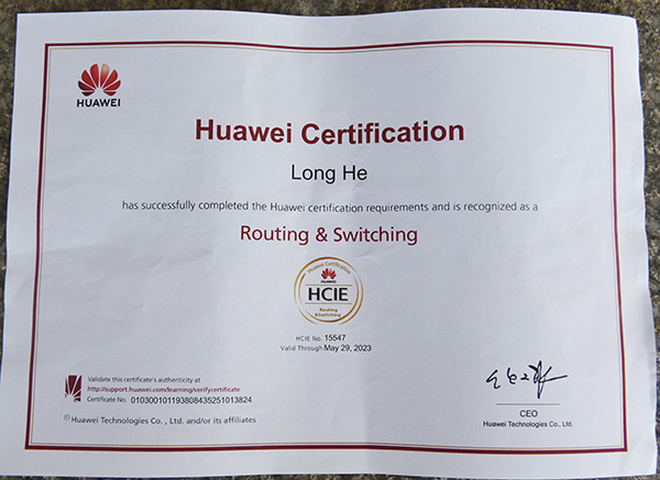 何龙同学通过了华为高级网络工程师HCIE认证(专家级网络工程师),他是我校拿到该认证的第一人,全球第15547名通过此认证者。华为认证是ICT 全技术领域认证体系,更是ICT 界公认的最高级别认证之一,该证书在华为相关产业链企业中通用。