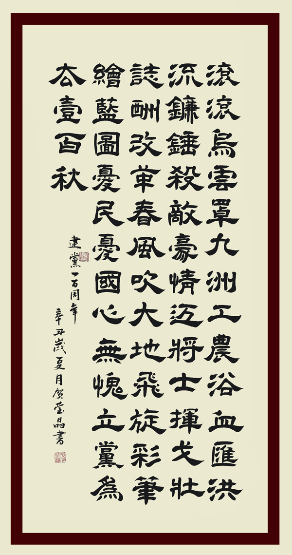 释文:滚滚乌云罩九洲,工农浴血汇洪流;镰锤杀敌豪情迈,将士挥戈壮志酬;改革春风吹大地,飞旋彩笔绘蓝图;忧民忧国心无愧,立党为公一百秋。