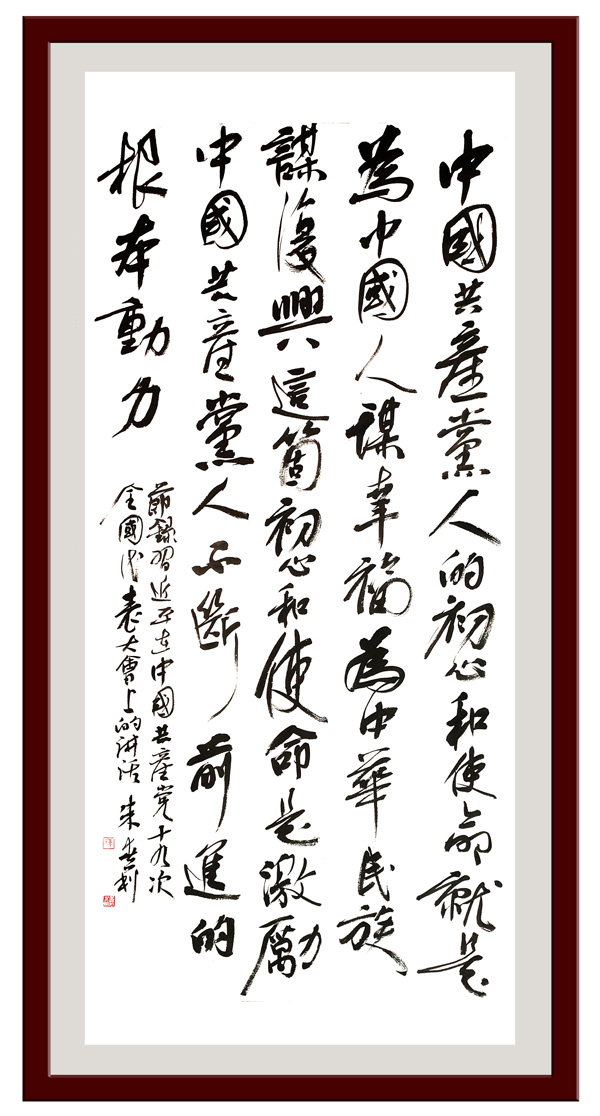 释文:中国共产党人的初心和使命,就是为中国人民谋幸福,为中华民族谋复兴。这个初心和使命是激励中国共产党人不断前进的根本动力。