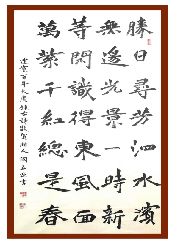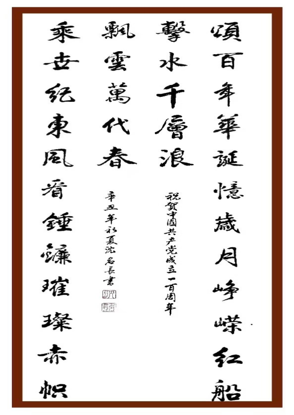 释文:颂百年华诞,忆岁月峥嵘,红船击水千层浪,飘云万代春,乘世纪东风看锤镰璀璨赤帜。