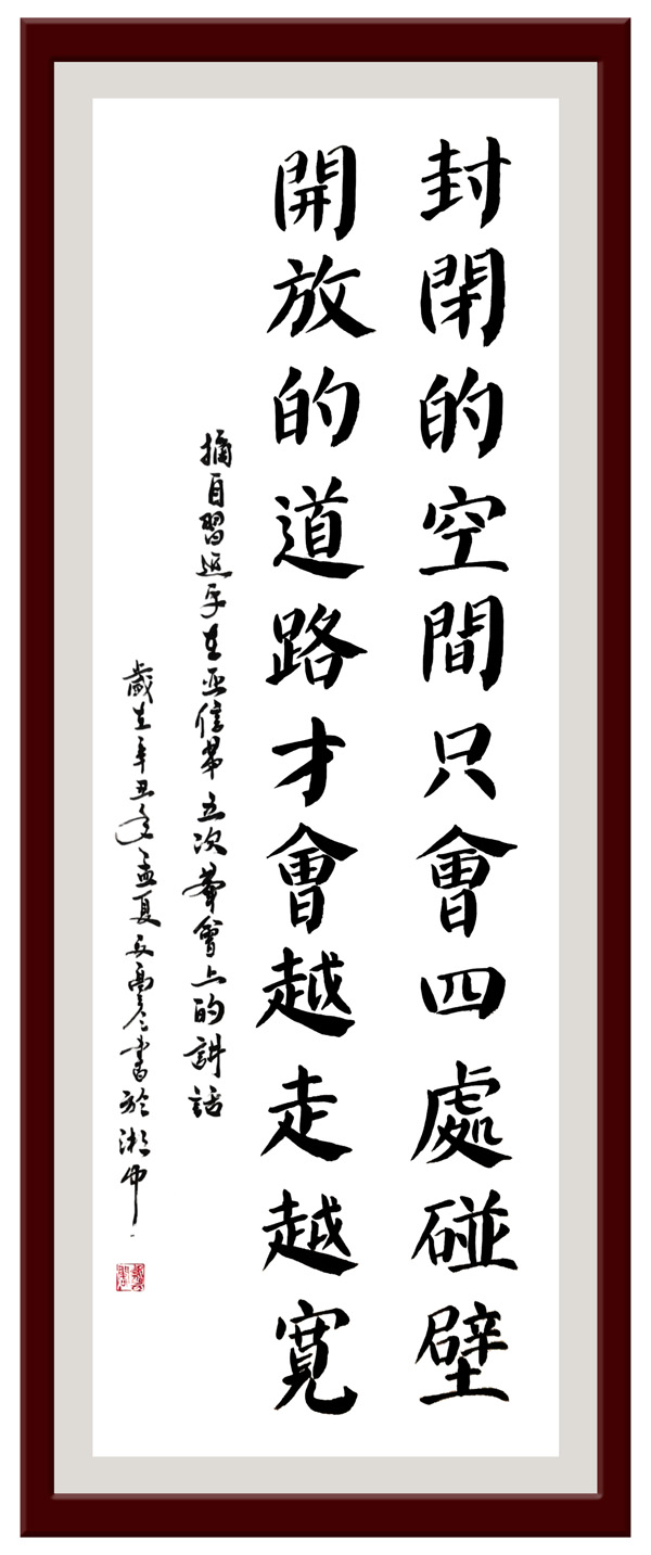 释文:封闭的空间只会四处碰壁,开放的道路才会越走越宽。