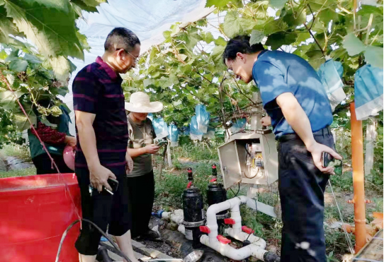 7月24日下午,小分队赴娄底市经济开发区大埠桥办事处宋家村娄底市旺春蔬菜专业合作社,解决了该基地喷灌设施过滤器及喷头堵塞的问题,喷灌设备恢复正常使用,及时缓解了大棚蔬菜遭受的严重干旱;同时指出了喷灌系统的日常维护要注意的问题;随后,小分队奔赴娄底市经济开发区中阳村五良生态农业有限公司指导“葡萄-蔬菜”立体种植滴灌设施的应用。