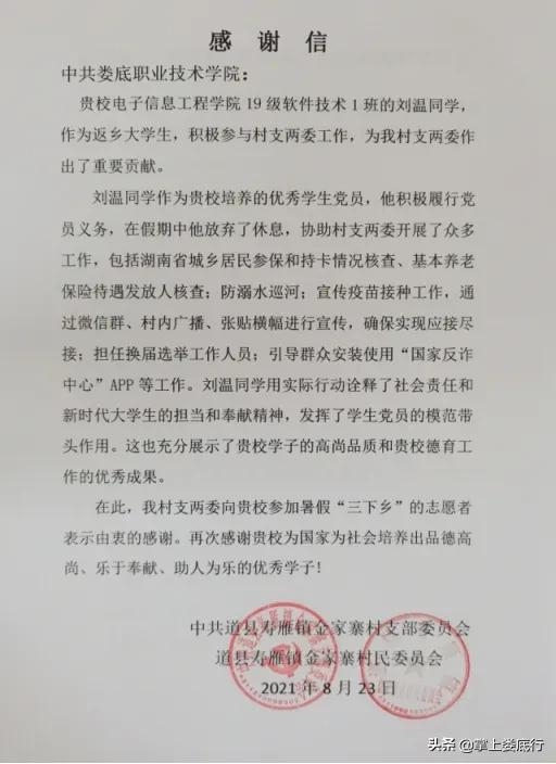 一封感谢信,家校两地情。刘温是娄底职院电子信息工程学院2019级软件技术1班的学生,返乡后,他主动到村支两委报到开展志愿工作,听从指挥,爱心奉献,在村支两委的领导和组织下积极开展工作:防溺水巡河、社保卡、基本养老保险待遇发放人核查、宣传疫苗接种等,他用实际行动诠释了新时代娄职大学生的责任与担当,为乡村振兴贡献了青春力量。