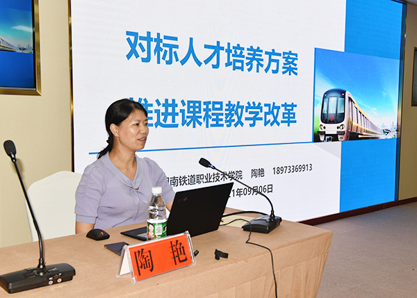 上午的培训由教务处处长朱燕主持,湖南铁道职业技术学院铁道轨道交通机车车辆学院副院长陶艳教授主讲。陶艳是全国黄炎培职业教育杰出教师,湖南省芙蓉教学名师,全国交通运输职业教育教学名师。陶教授主讲的专题是《对标人才培养方案推进课程教学改革》。她详细介绍了人才培养方案的调研、论证和制订,就课程教学设计和课程改革实施等做了深刻的阐述。
