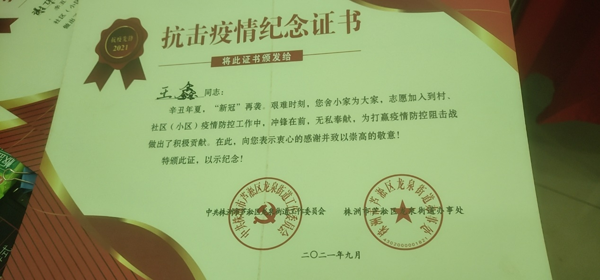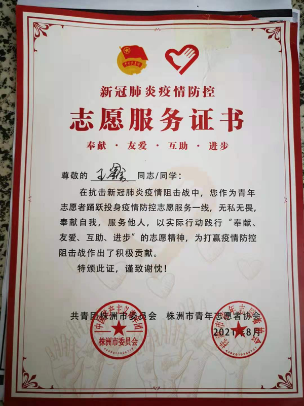 “以前作为群众,在排起的长队面前浮躁的心中少不了抱怨和吐槽。今日再一次面对长队体验,其中却是深切的感受到了周围的社区工作人员和志愿者衷心为群众服务的热情。他们深爱着这片土地,拥护着这些群众。这次抗击疫情的时间不是特别长,却非常充实,感觉自己又一次成长了,虽然肉体上会累过,疲惫过,但精神上却是无比的喜悦和满足。在这里有许多优秀的人民,大家团结一心,共同抗疫,形成了株洲抗疫的坚固防线。让我对一方水土养育一帮人有了更深的理解。”这是王鑫参加完抗击疫情的后的深切感受。