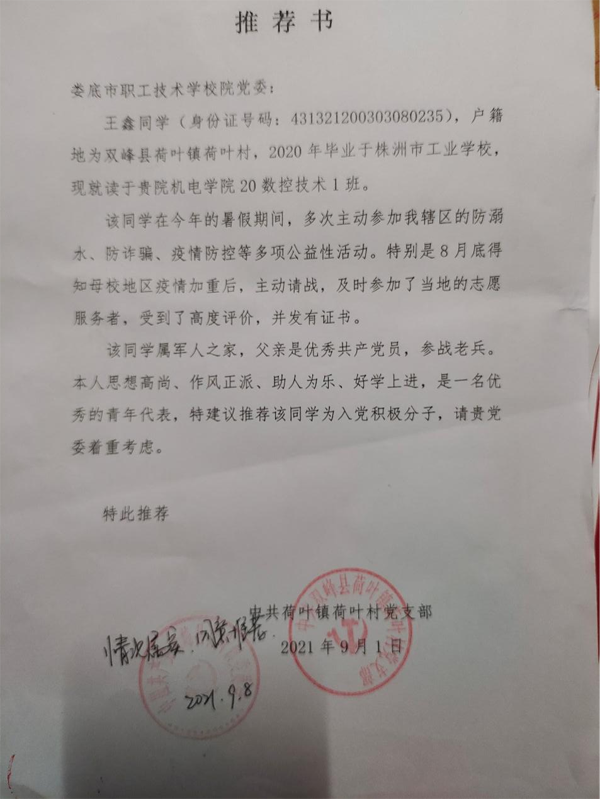 开学之初,株洲市荷叶镇荷叶村党支部向我校寄来一封感谢信,表扬了我校机电工程学院20数控班的王鑫同学作为一名青年志愿者积极投身疫情防控的第一线的优秀事迹。