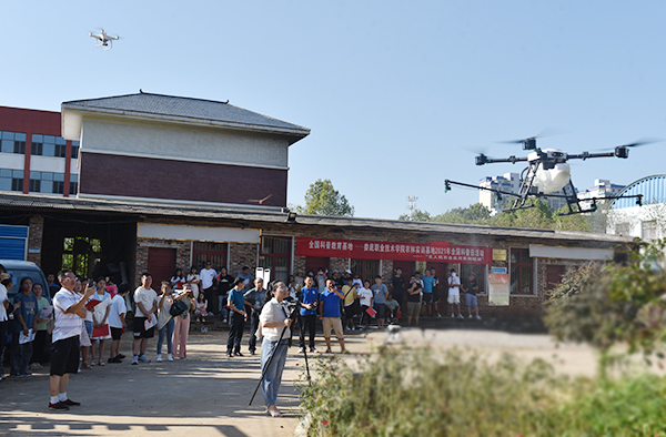 在农林实训基地,师生们饶有兴趣地聆听着无人机农业应用的有关知识讲解,现场观摩了无人机的操作,起飞、盘旋、喷洒;