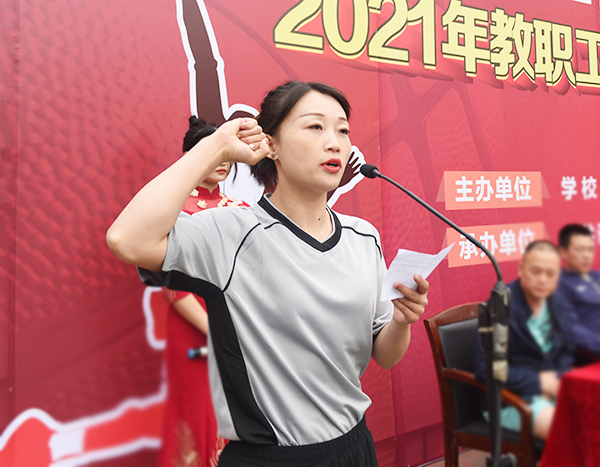 刘瑜峰老师代表全体运动员宣誓,表示将在比赛中顽强拼搏,公平竞争,赛出水平。