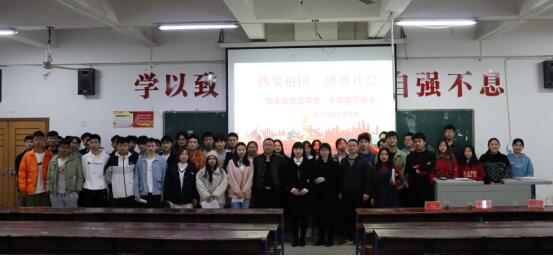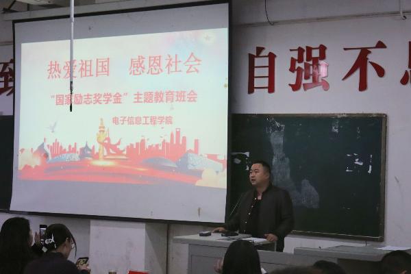为了加强学院班风,学风建设,加强对学生的诚信、励志、感恩和成才教育,强化学生的自尊、自强、自信和自立意识,培养以德立身、明礼诚信、自强不息的新时代大学生,构建和谐互信的美丽校园,2021年11月25日下午16点30分,电子信息工程学院在主教楼110教室开展了国家励志奖学金感恩主题班会。参加会议的有电子信息工程学院副院长邓明亮、学工干事林莎老师、辅导员周永坚老师、李韶辉老师,刘利辉老师、刘婷老师、黄娟老师、以及所有获得国家励志奖学金的同学们。大会由学生会副主席徐亮主持。