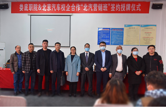 11月26日,我校与北汽集团举行校企合作签约授牌仪式。北汽集团蓝谷营销服务有限公司渠道运营部培训科项目经理梅振如、湖南大区经理刘贤,娄底市鑫邦汽车贸易有限公司销售总监刘国平、行政经理成丹参加。我校副校长游新娥出席活动,产教融合办主任晏然,汽车学院院长聂进、总支书记苏志华、副院长陈宝华、李铁侠、“北汽营销班”项目相关成员以及汽车学院20级、21级汽车技术服务与营销班的学生参加仪式。