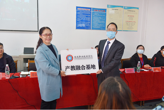 游新娥向企业负责人授予“娄底职业技术学院产教融合基地”牌匾;企业负责人向汽车学院授予“BSEP-北汽营销班校企合作人才培养基地”牌匾。