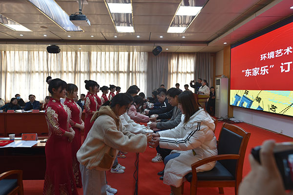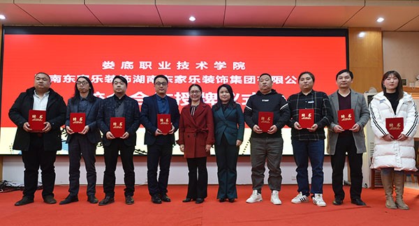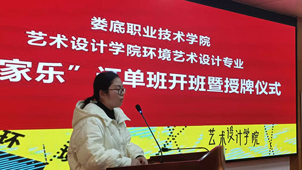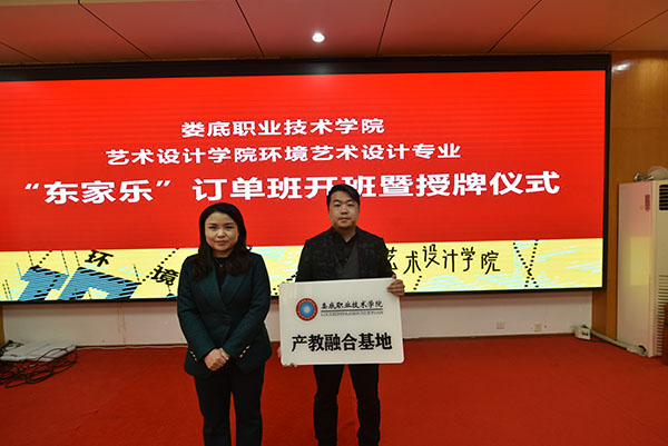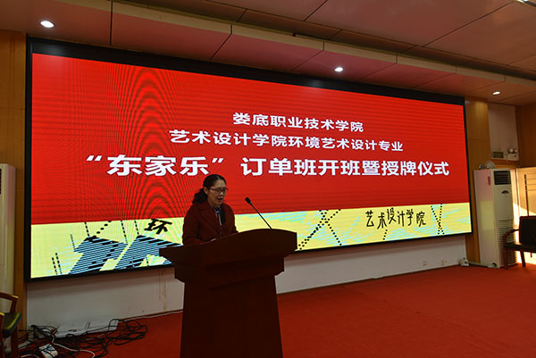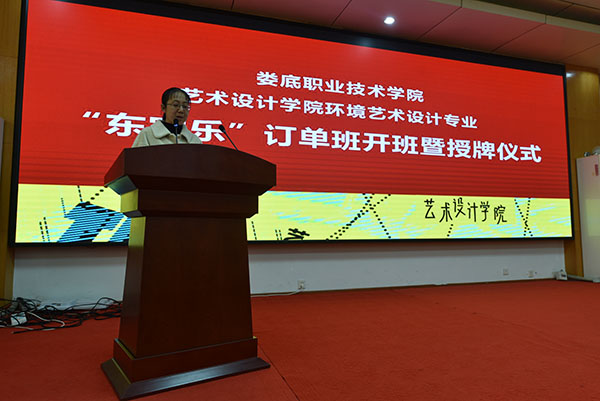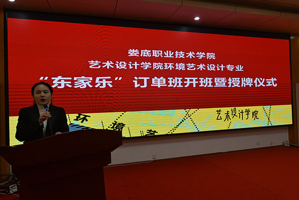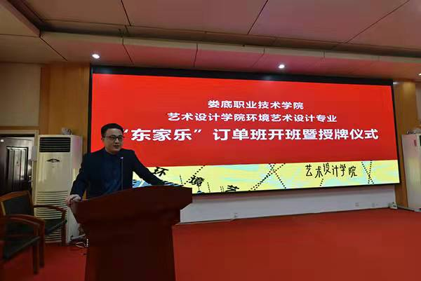 12月9日下午,艺术设计学院环境艺术专业“东家乐”订单班开班暨授牌仪式在多功能报告厅举行。东家乐装饰集团部分代表,校长张征澜,副校长游新娥、欧芳,产教融合办主任晏然,艺术设计学院院长夏高彦、党总支书记曾晓杰,副院长张海峰、张雯宇,环境艺术专业全体教师、辅导员,订单班全体学生和2020、2021部分学生代表参加此次仪式。仪式由夏高彦主持。