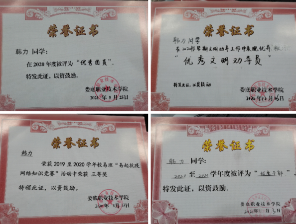 通过不断努力,韩力先后获得国家励志奖学金、优秀共青团员、优秀学生干部、“雷锋号”个人以及学校十大励志人物等荣誉称号。此外,她还积极向党组织靠拢,如今已经是一名中共预备党员。
