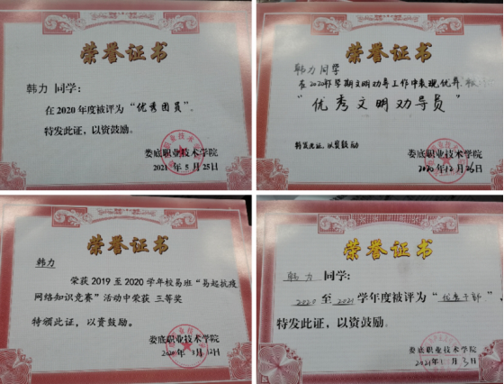 据悉,通过不断努力,韩力先后获得国家励志奖学金、优秀共青团员、优秀学生干部、“雷锋号”个人以及学校十大励志人物等荣誉称号。