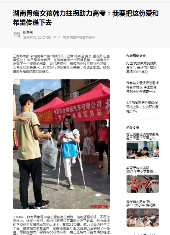 2014年,韩力因意外被迫截掉了左腿。她自强不息,努力学习,2019年,考上娄底职业技术学院,成为商学院2019级电商1班学生。学校高度重视,积极将资助和育人有机融合,把“扶困”与“扶志”紧密结合,以立德树人为根本,构建物质帮助、道德浸润、精神激励有效融合的资助育人长效机制,从入学、资助、生活等多方面关心、帮助韩力。在生活上,商学院将韩力的寝室从二楼调整到一楼,让韩力住在下铺,安排辅导员、学生干事随时关注韩力情况,让班上同学在平时上课、生活、出行等各方面帮助她。在经济上,商学院积极为韩力申请助学金,不仅解决了韩力的经济问题,减少父母的负担,而且也点燃了韩力在大学阶段奋斗的激情。