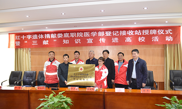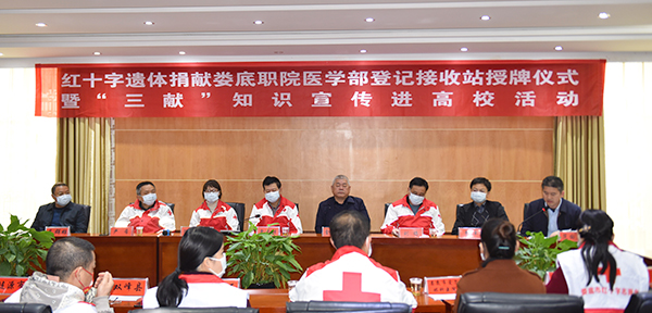 12月15日,红十字会遗体捐献登记站授牌仪式在我校医学部举行。娄底市红十字会党组书记、常务副会长曾启明,党组成员、副会长徐和平,秘书长刘鸥,娄星区红十字会常务副会长严希,我校党委委员、副校长兼医学部主任金建雄,学校顾问曾卓,医学部常务副主任范国正、总支书记吴群雄出席仪式,各县市区红十字会三献工作分管领导,娄底市无偿献血、造血干细胞捐献、器官遗体捐献志愿服务队骨干队员及志愿者代表,湖南省红十字会角膜捐献娄底爱尔眼科登记接收站代表,遗体捐献者家属代表参加。范国正主持仪式。