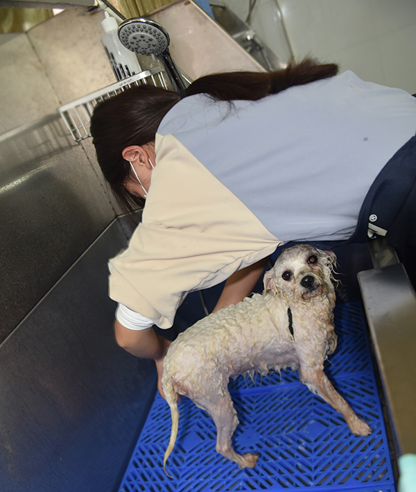 中级考试除完成初级基础项目,要求考生在湿区用真犬完成模特犬的保定与基本护理、洗浴、吹干、梳理及洗后护理等项目操作。