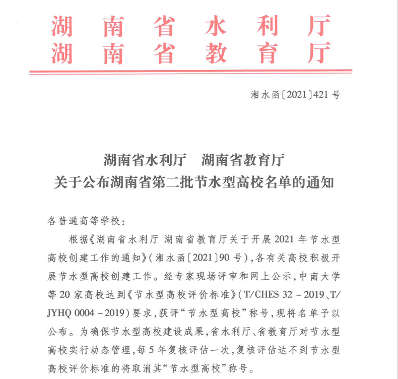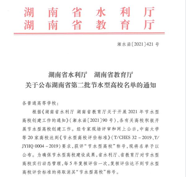 经湖南省水利厅、湖南省教育厅联合评选,湖南省近日公布第二批节水型高校名单,中南大学、娄底职业技术学院等20所高校被评为湖南省节水型高校。