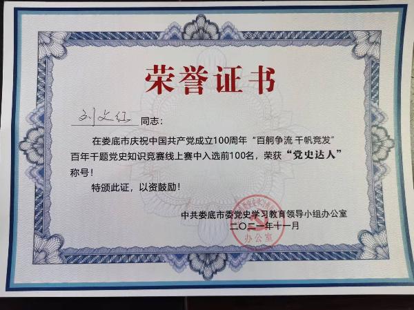 为持续深入推动党史学习教育,2021年7月-10月,由中共娄底市委党史学习教育领导小组办公室主办,娄底新闻网承办的娄底市2021年“百舸争流 千帆竞发”百年千题党史知识竞赛线上活动在全市党员中开展,按照评选规则,活动按累计积分排名评出全市100名“党史学习达人”。我校审计处处长刘文红排名第24位,荣获“党史达人”称号。(刘艳)
