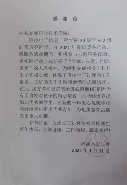 2022年1月31日,怀化市辰溪县辰溪义工协会向我校寄来一封感谢信,对我校大学生邓辰亮同学积极参与2021年春运暖冬行动志愿服务活动所做的贡献表示感谢,感谢他尽职尽责,全力以赴,展现着新时代青年的责任与担当,用青春精神书写华彩篇章。