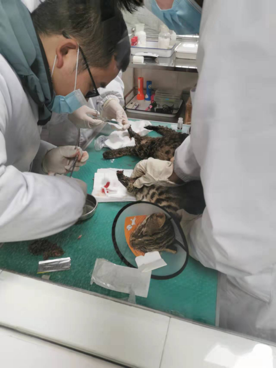 2月16日上午9点,娄星区林业局工作人员将因非法捕获受伤的一只野生豹猫送到我校动物医院抢救。医生们接到救治电话后马上制订了详细的救治方案,豹猫进院后争分夺秒进行了全麻、伤口清理消毒、缝合等一系列救治措施。
