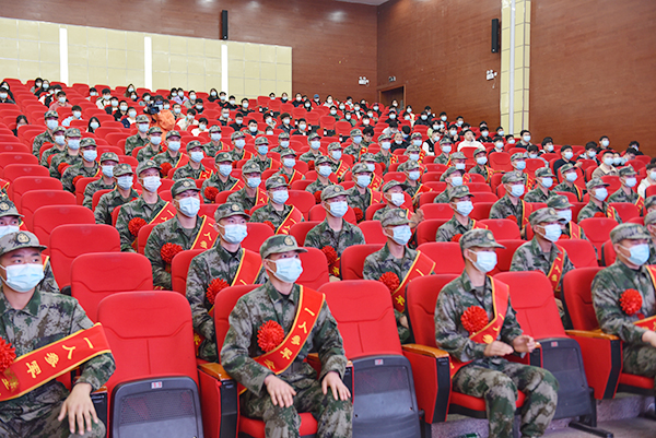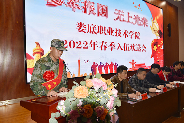 入伍学生代表谢天成代表此次69名新入伍学生发言,感谢父母的养育、学校的培养、老师的教育,表达了建功军营、献身国防的坚定决心。