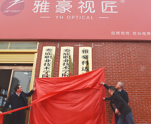 仪式上,学校校长张征澜、副校长金建雄与企业代表彭向阳共同为“临床医学院眼视光技术专业校内生产性实训基地及创业协会眼视光分会”揭牌。