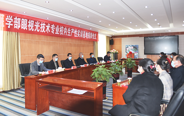 彭向阳介绍了雅豪科达科技有限公司的概况及眼视光技术未来发展前景,并介绍“临床医学院眼视光技术专业校内生产性实训基地”发展规划,表示建立一个长期的、可持续发展的生产实训基地,实现学校、学生与企业互利共赢。
