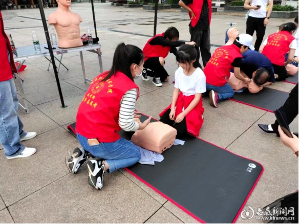 (志愿者指导市民进行心肺复苏技术模拟操作)