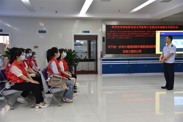 社会实践活动期间,娄底职业技术学院的“大学生税官”在税务老师的指导下进行为期两个月的实践活动,通过纳税服务礼仪、办税大厅业务流程、电子税务局的预约和申报、代开发票业务等方面的现场实训,“沉浸式”了解税务工作。