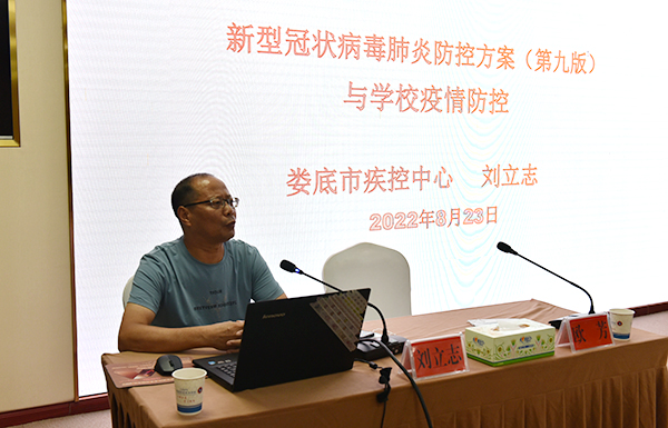 市疾控中心学校卫生室主任刘立志从修订第9版的疫情防控方案进行介绍,对总体要求、疫情处置、重点环节防控等方面进行了详细的疫情防控培训,并对学校疫情防控管理提出了要求。