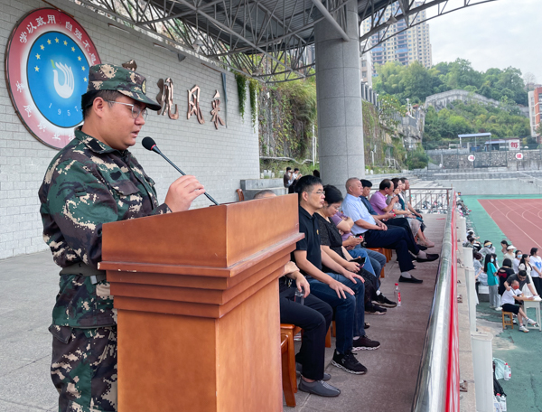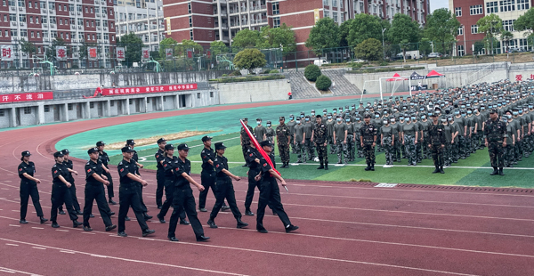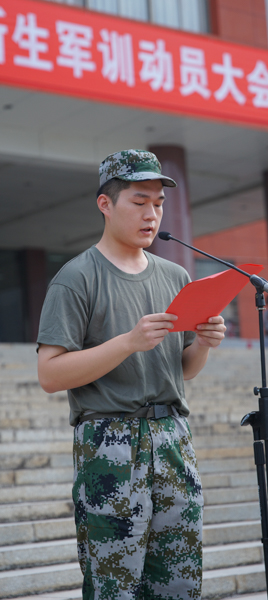 新生代表2022级华为网络一班戚国茂发言,表达了不怕苦,不怕累,高标准完成军训任务的决心。