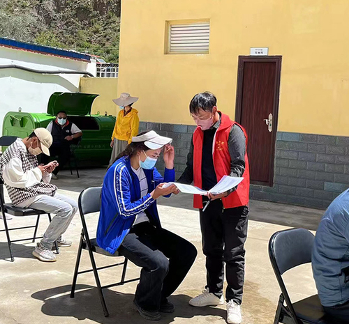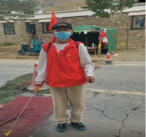 本网讯 娄底职业技术学院2020级畜牧班学生嘎松丁增家在西藏昌都市左贡县旺达镇夯达村。今年的暑假他成为当地的抗疫志愿者,过的和往年很不相同。早上6点半起床,吃完早饭后,嘎松丁增从家里出发。因为他所在的村离镇上有30多公里,为了方便他们这些志愿者,政府安排了车接送。8:00,志愿者们集合完毕,镇里的工作人员将今天的主要任务布置下来,志愿者们就按照分工,开始一天的忙碌:到社区开展疫情防控宣传,做好进出口检查、站点值守,对一些重点区域和重点部位消毒,对居民情况进行摸底调查、帮助居民采购生活物资……