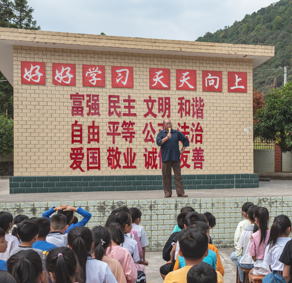 10点半,驻村第一书记林迎辉陪同戴谋道老师来到了芷溪小学,为全校6个年级共100余名学生在操场讲课。他手拿话筒娓娓道来,年近八旬的老同志一直站着讲完,主要重点介绍了毛主席如何尊敬他的国文老师袁吉六先生的故事,给同学们上了一堂生动而富有启迪的尊师爱师课。