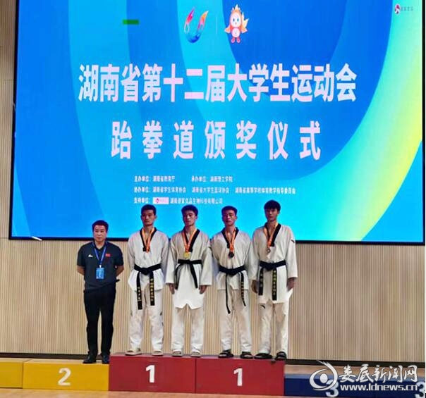 娄底职院对本次大学生运动会高度重视,成立了大运会代表团,由校党委委员、副校长游新娥任团长,公共课教学部主任付鹏任秘书长。共参加了田径、羽毛球、游泳、跆拳道、排球、足球、体育舞蹈、啦啦操八大项比赛。运动员们奋发进取、积极拼搏,最终杨鑫同学荣获跆拳道68公斤级冠军,陈哲同学获得跆拳道67公斤级季军,邓欣镕同学获得100米仰泳季军,娄底职院获4*100米游泳混合接力季军、体育舞蹈国标团体季军和拉丁健身项目季军,最终以1金5铜,团体总分第16名的优异成绩交出了满意的答卷。娄底职院还荣获“优秀体育代表团”称号,付鹏、曾海军、邹定华、胡贞渝、岳茂平、肖吉清荣获“优秀教练员”称号。