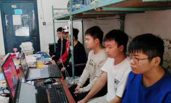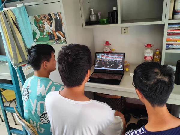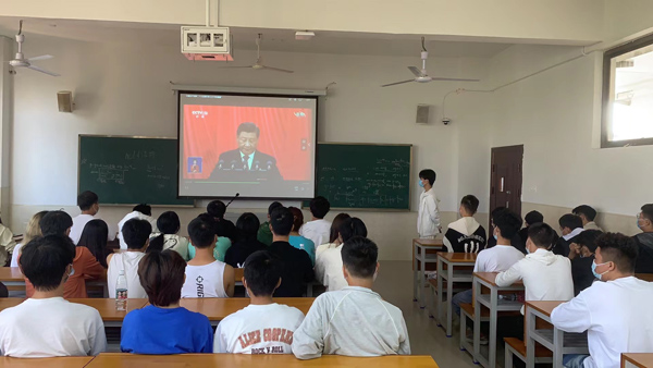 在综合楼2楼视频会议室,党委理论学习中心组成员与学生代表共同观看。