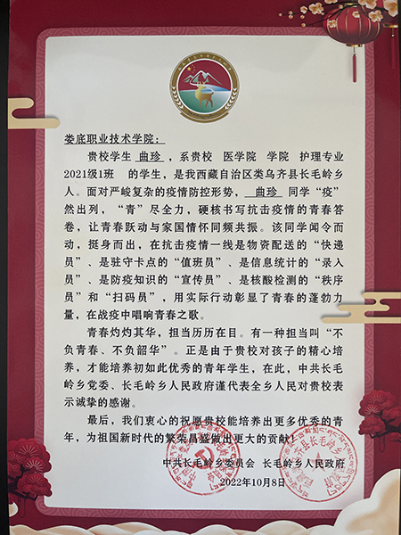 10月下旬,娄底职院收到一封来自西藏自治区昌都市类乌齐县长毛岭乡党委和政府的表扬信,信中提到:娄底职院2021级护理1班学生曲珍在当地积极参加抗疫工作,志愿者们是“物资配送的‘快递员’、驻守卡点的‘值班员’、信息系统的‘录入员’、防疫知识的‘宣传员’、核酸检测的‘秩序员’‘扫码员’,用实际行动彰显了青春的蓬勃力量,在战役中唱响了青春之歌。”并对娄底职院培养了优秀的学子表示感谢。
