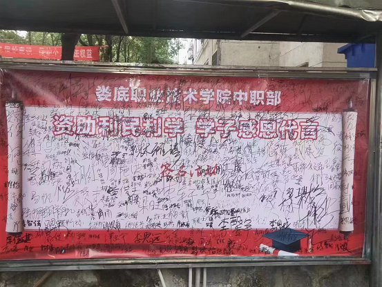 10月27日下午,娄底职业技术学院中职部于南苑三教学楼前举办“资助利民利学,学子感恩代言”签名活动,呼吁全体中职部学子积极参与为国家资助政策代言签名活动。