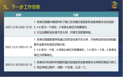 会上,各单位就坦桑尼亚畜牧兽医NAT 4-8级国家职业标准开发大纲展开了积极的讨论和交流,确立了按“定岗位→定职责→定能力→定技能”的顺序开发畜牧兽医4-8级职业标准大纲的思路,明确了各单位大纲开发的职责和任务,确保大纲开发任务能按照时间节点和要求高效有序进行。
