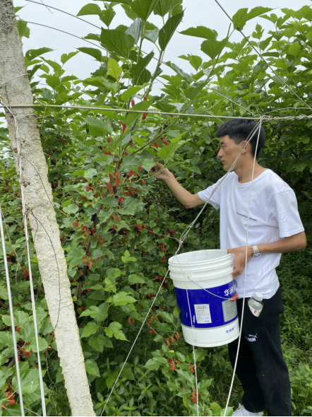 来自西藏的大学生在采集加工桑葚红酒的原料果桑