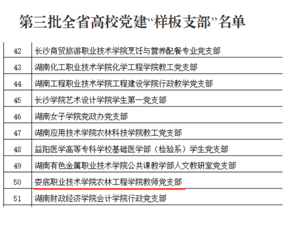 近日,中共湖南省委教育工作委员会公布了全省高校党组织“对标争先”建设计划第三批项目评选结果。我校农林工程学院获评全省高校党建工作“样板支部”,农林工程学院党总支副书记王琦、商学院大数据与会计专业教研室主任丁祎获评高校“党务工作示范岗”和“青年教工党员示范岗”。(朱亚鹏 李莉)