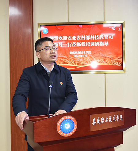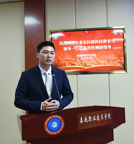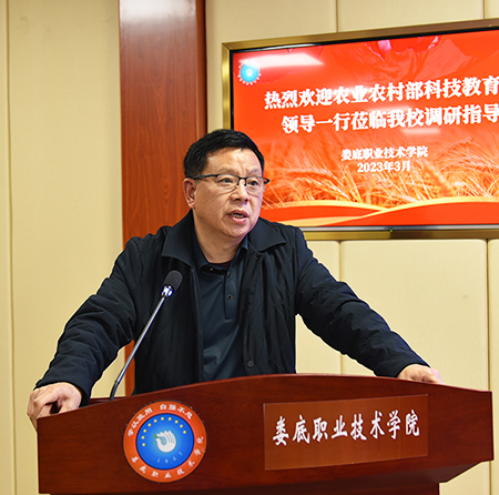 校长张征澜对我校人才培养,优质校建设及服务乡村振兴,培训和学历教育培养情况以及存在的问题等作了详细汇报。我校共开设4个涉农专业群,并在实习实训及就业指导服务、公费生农科生培养方面作出了积极努力;坚持把科教融汇作为重要抓手,指导学生进行品种实验和创新创业实践,积极开展校企合作和技术研发;做好顶层设计,实现全员参与,首创实施“村干部定向培养工程”,扎实开展乡村振兴“十百工程”,积极为西部少数民族地区培养乡村振兴人才,开展技术推广与服务,打造产教融合实习实训基地;推进高素质农民培育及乡村基层人才培训,中高衔接,做好三二分段贯通培养。