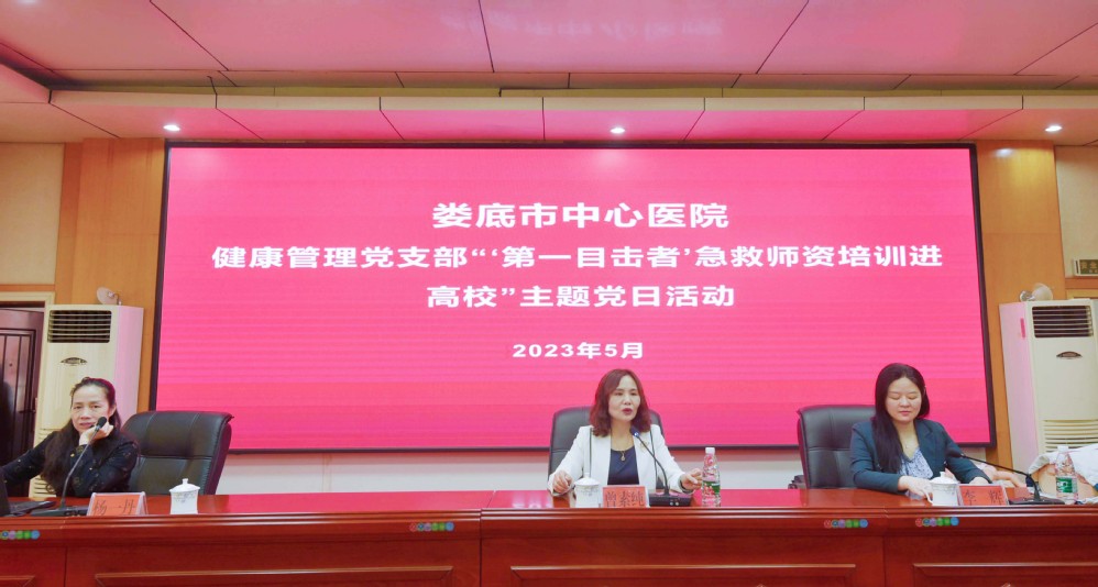 我校工会常务副主席曾素纯对娄底市中心医院一行表示热烈的欢迎,希望大家在本次培训班上学有所成,能做到真正学以致用。市中心医院健康管理中心主任、健康管理党支部负责人李辉在致辞中表示,市中心医院高度重视健康知识科普,今后将把业务和党建深度融合,大力开展“校园健康科普”一系列主题党日活动,以实际行动为广大师生的身体健康及安全保驾护航。