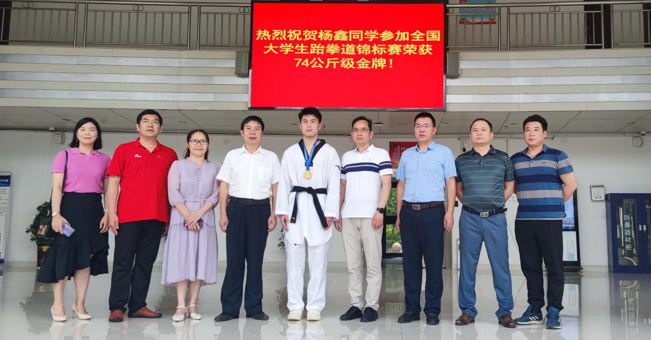 6月1日,在综合楼大厅,校长张征澜、党委副书记王健龙、副校长周志和、游新娥、纪委书记左学亲切慰问了斩获全国跆拳道锦标赛金牌的杨鑫同学和取得了省教职工篮球赛一等奖的篮球队员们。公共课部主任付鹏、副主任邓梦兰、党支部副书记曾海军参加见面会。